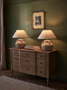 We love the grand scale of this lamps, ideal placed atop a chest of drawers or large bedside cabinet.