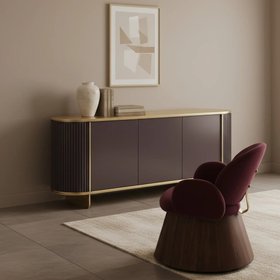 A perfect harmony of materials and forms. A sculptural rounded silhouette of a wooden structure with ribbed detail and a beautiful lacquered finish. A modern minimalist steel base, legs and vertical profiles sanded and liquid-varnished in a lustrous brass finish complete this fabulous design. Incorporating concealed hinges with soft close functions, opened by means of a soft groove on the top of the doors. Includes one internal shelf per compartment, as standard. Weight 90 kg. Also available with a lacquered top, and in alternative finishes and various sizes by request.