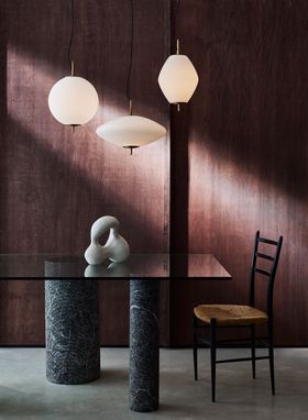 In three elegant shapes, Nova's celestial inspired silhouettes explore spherical form and the sculptural possibilities of mouth blown glass. Chosen for its porcelain-like texture, the opaline, sandblasted glass shades provide a warm diffused illumination when lit, creating a soft and ethereal atmosphere.
