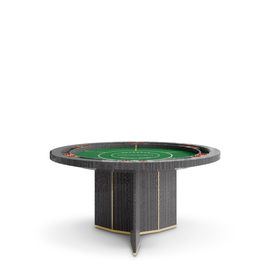 DeepL TranslateAlgerone meets Texas Hold 'Em most exceedingly, with high-end design taking a playful turn. This dynamic table design features a structure in Eucalipto Frise Veneer, padding in grey velvet, and outlines in polished brass for a timeless aesthetic. The rounded table can accommodate between six to eight players.