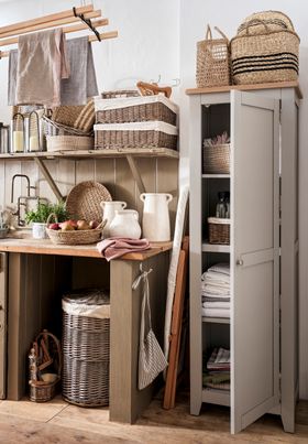 DeepL TranslateChester Dove Grey Shaker Cupboard £499, Accessories: On Top Of Cupboard- Seagrass Bag £20, Palm Leaf Seagrass Storage Basket Small £24. Inside Larder- Seagrass Storage Basket Small £20, Medium Antique Wash Tray £19. Top Shelf- Seagrass Rectangular Tray Medium £29, Seagrass Rectangular Tray Small £20, Glass And Metal Hurricane Lantern Small £26, Seagrass Tray Small £15, Seagrass Palm Leaf Storage Basket Small £18, Large Antique Wash Tray £25, Small Square Antique Wash Storage Basket £20. Bottom Shelf- Withington Bowl 24.5cm £24, Seagrass Tray £10, Seagrass Round Tray Small £!5, Ravello Vase Small £23, Ravello Flower Jug 928.668, Ravello Vase Large £33. Under unit- Small Antique Wash Deluxe Garden Tool Basket £29, Large Lined Laundry Basket £79