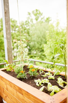 DeepL TranslateEin voll gepflanztes Hochbeet steht auf einem Balkon.