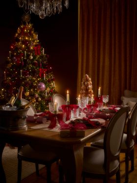 A rich green base simply pairs with a green ribbon for a subtle and stylish finish to your Christmas table.