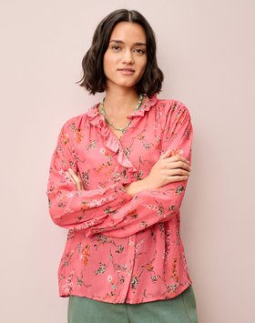DeepL TranslateMade from a sumptuous silk georgette fabric, this popular, adaptable blouse shape, adored for its charming, frilled neckline and placket, has been reimagined into three new, colour-clashing botanical prints for Spring-Summer.