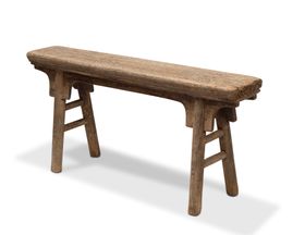 DeepL TranslateThis narrow bench is a versatile addition to any space, perfect for providing extra seating at the end of a bed or in a window alcove. It follows the traditional style of wooden benches used throughout China for centuries, both indoors and outdoors. These pieces are sometimes referred to as 'Spring benches' and were often placed outside of restaurants, shops, and other small businesses for customers or staff to take a rest. This specific bench is from Shanxi province and, like most furniture from the region, is constructed from durable elm wood, now with a wonderful, weathered finish. The bench seat is made from a single elm plank and the classic Chinese design features A-frame, rounded legs, supported by double strechers, that fit snugly into the underside of the seat.