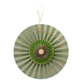 Beautiful handmade rosette in recycled soft cotton-based paper and embellished with exquisite glitter details. Perfect for hanging at Christmas time for some festive glamour. Artichoke and gold colourway. Diameter 26cm