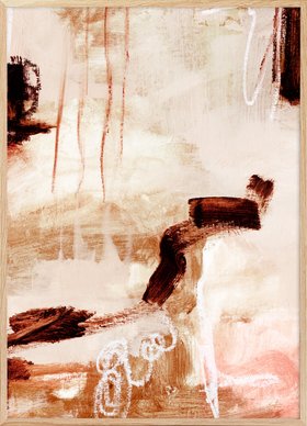 Abstract print with brown and cream brush strokes and white chalk-like circles. This hand-painted print has a rough, textured look with hints of pink.