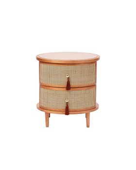 DeepL TranslateAdd a natural touch to your home with this double-drawer bedside table, made from mindi wood with a woven rattan front. Standing on four short legs, it has a curved shape with two deep drawers, with a contrasting dusty pink metal top that brings a pop of colour to the natural finish of the wood. This eye-catching piece is finished with two wine-toned tassels hanging from small brass drawer pulls.