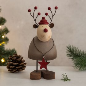 Large Rustic Standing Wooden & Metal Reindeer Ornament with Red Bobble Hat & Star Pendant – Weathered Scandi Festive Christmas Decoration 19x11x8cm