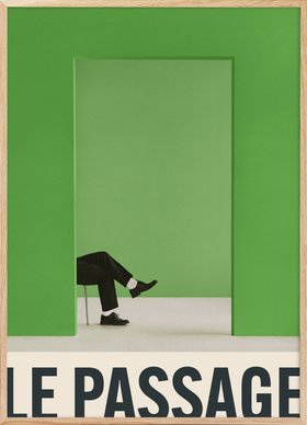 A print showing a green wall with a doorway and a person sitting, wearing black trousers and shoes. The text "LE PASSAGE" is featured at the bottom.