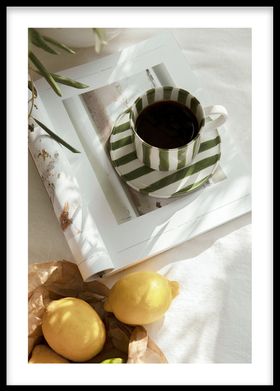 Print illustrating a striped cup of coffee on top of a book next to some lemons. A beautiful photo print in soft hues.