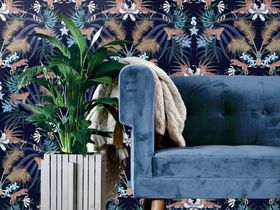 Add a̴ sense of glamour to any room with our stunning Leopard Luxe Wallpaper designed by Becca Who for Graduate Collection. Set on a gorgeous deep blue background, this simple yet striking wallpaper design features leaping leopards prowling amongst golden palms and pineapples, resulting in a majestic design of striking elegance, which creates a beautiful focal point in an interior.
