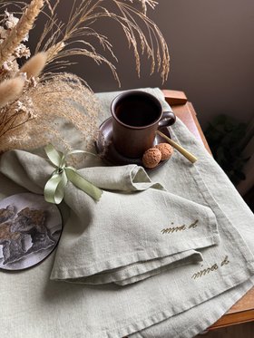 Beautiful handmade 100% linen napkin in earthy Olive green from Lithuania. Produced by a family business using flax which offers a very sustainable process and finished to the highest standard. Hand embroidered ‘nina d’ logo, my linen products are the perfect addition for any occasion. From a celebratory meal to a relaxing weekend breakfast.