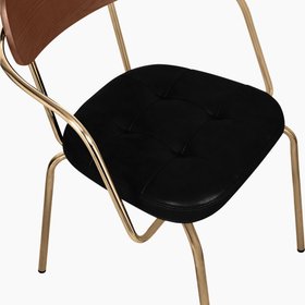 The Maddox Carver Dining Chair with a vintage black seat and brushed brass frame combines comfort with design. This industrial-inspired chair has the practicality and durability for a vibrant dining environment mixed with luxury style. Featuring a wooden backrest, faux leather seat cushion, and metal frame, the Maddox Chair Range uses rich tones and a combination of materials for a comforting retro design.