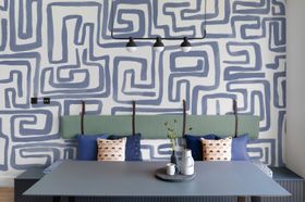Warm terracotta tones meet a maze-inspired geometric design in this hand-painted mural. The flowing lines add organic character, making it ideal for adding warmth and artistry to contemporary interiors.