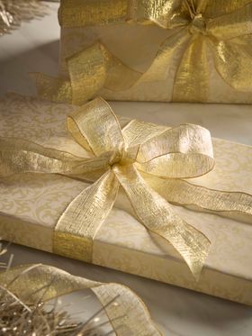 A classic metallic gold ribbon with plenty of sparkle for sophisticated gift wrapping.