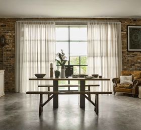 Oculus Pure White Magic Screen Roller Blind & Aurelie Voile Shell Curtains