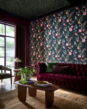 Where wildflowers meet the stillness of deep water. Painterly Flora Teal is a study in contrast. Florals full of energy, layered over a backdrop of serene, slate-leaning teal. The effect is grounding yet vibrant, like a hidden garden coming to life beneath a summer storm. Each botanical detail feels intentional but never rigid. Clusters of ivory daisies, vivid coral blooms and cornflower blues unfurl beside foxgloves and trailing stems in soft pink and violet.