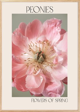A poster with a beautiful pink peony flower with delicate petals and a green centre. The text "Peonies" and "Flowers of Spring" adds a lovely botanical touch to this floral wall art.