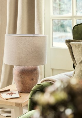 DeepL TranslateChester Limestone Nest Of Tables £199, Morris 3 Seater Sofa in Forest Green Matt Velvet £2,099, Perrinsfield Brown Table Lamp £99, Marling Linen Mix Oatmeal Curtain Pair from £90