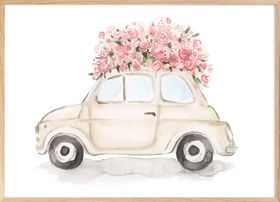 DeepL TranslateVintage beige car filled with pink flowers. This watercolour poster adds whimsy to any wall.