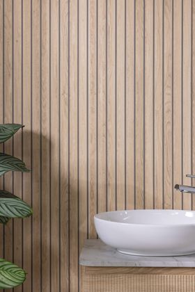 Slatted Wood Effect Sivara shower panels bring the sought-after SlatWall style into bathrooms, showers and rooms that demand zero compromise. Designed with a super-matt wood-grain detailing, alongside a 3D effect shadow gap, these advanced PVC panels add the natural warmth and contemporary structure of an acoustic slat panel whilst being 100% waterproof, lightweight and cleanable. The vertical slatted effect enhances height in any room and creates a luxury feature wall, perfect for spa-like spaces or modern interiors requiring more versatility.