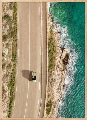 DeepL TranslateA print showing an aerial view of a coastal road with a green car, blue ocean waves, and rocky cliffs on a sunny day.
