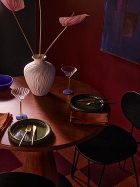 DeepL TranslateFigura Four-seater Dining Table, Dark Brown Acacia & Matt Black pictured with Kyoto Dining Chair, Set of Two, Matt Black & Black Mango Wood.