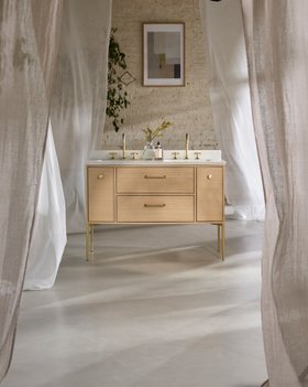 The Walcot 1200 Freestanding 4 Drawer Vanity Unit combines practical storage with classic design. Crafted from real wood veneer and finished with soft-close inlay joinery. Choose from knobs as standard, or our choice of handles to make yours unique. Featuring high-quality Hettich soft-close runner drawers, giving you a smooth and luxurious soft closing action. With ample countertop space on either side of the basin, there is plenty of room for toiletries and full-height drawers for storing tall bottles out of sight. This elegant and refined unit in three elegant finishes adds a touch of texture to bathroom furniture, creating a welcoming and relaxing atmosphere.